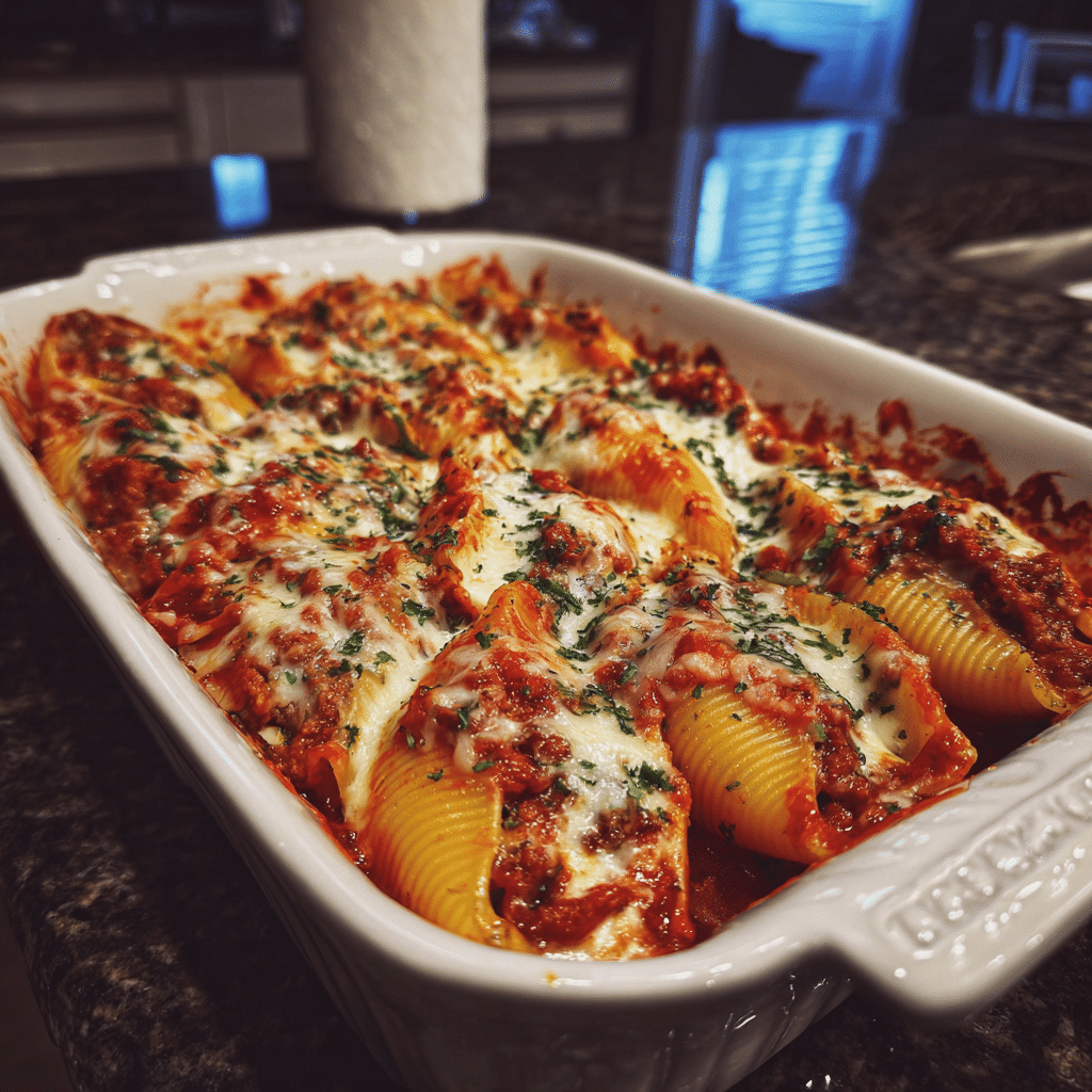 Beef-stuffed pasta shells filled with seasoned ground beef and creamy ricotta, baked in marinara sauce and topped with melted cheese for a comforting Italian-style dinner.