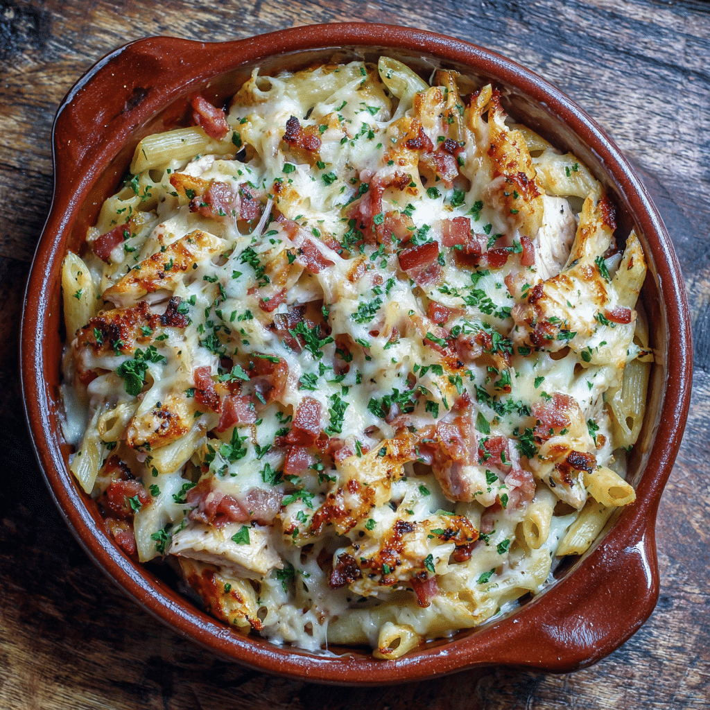 A comforting cheesy chicken and bacon pasta bake made with tender chicken, crispy bacon, creamy sauce, and bubbly melted cheese, perfect for family dinners.
