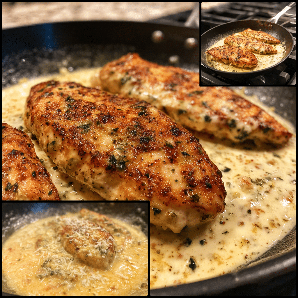 7. Return the chicken to the skillet and spoon the creamy cheese sauce over it. Let it simmer for 2–3 minutes.