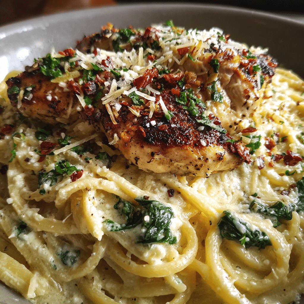 A comforting pasta dish made with tender chicken, creamy garlic Parmesan sauce, and fettuccine noodles for a rich and flavorful dinner.