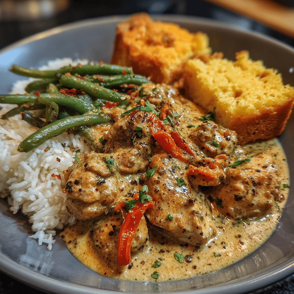 Tender chicken simmered in a rich and creamy black pepper sauce, served over fluffy rice with seasoned green beans and warm cornbread. A comforting Southern-inspired family dinner.