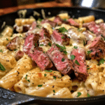 Creamy Ranch Steak & Mozzarella Garlic Butter Pasta is the type of dish that turns an ordinary dinner into something indulgent and memorable. With tender slices of seasoned steak, a velvety ranch-infused sauce, and stretchy mozzarella woven through buttery garlic pasta, every bite feels warm, bold, and deeply comforting. What makes this recipe especially appealing is how effortlessly the flavours harmonise—savory steak, creamy ranch, melted cheese, and fragrant garlic butter all come together without requiring complicated steps. When I tested a variation using almond milk to lighten the sauce slightly, the creaminess was still impressive, proving how adaptable and forgiving this recipe is. Whether you’re hosting guests or craving something hearty after a busy day, this dish delivers restaurant-level satisfaction with simple, reliable techniques.