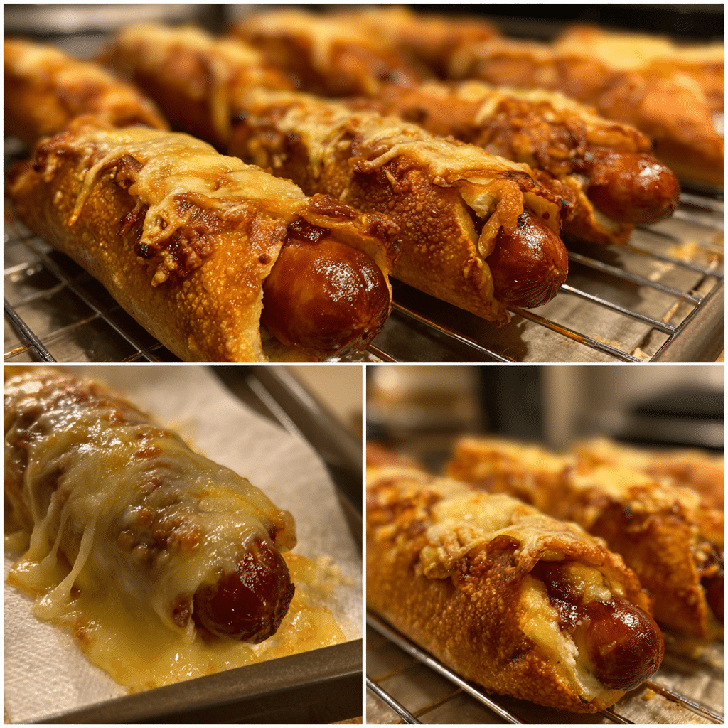Crispy cheesy hotdogs wrapped in golden dough with melted cheese inside, perfect as a quick snack, appetizer, or fun family meal.