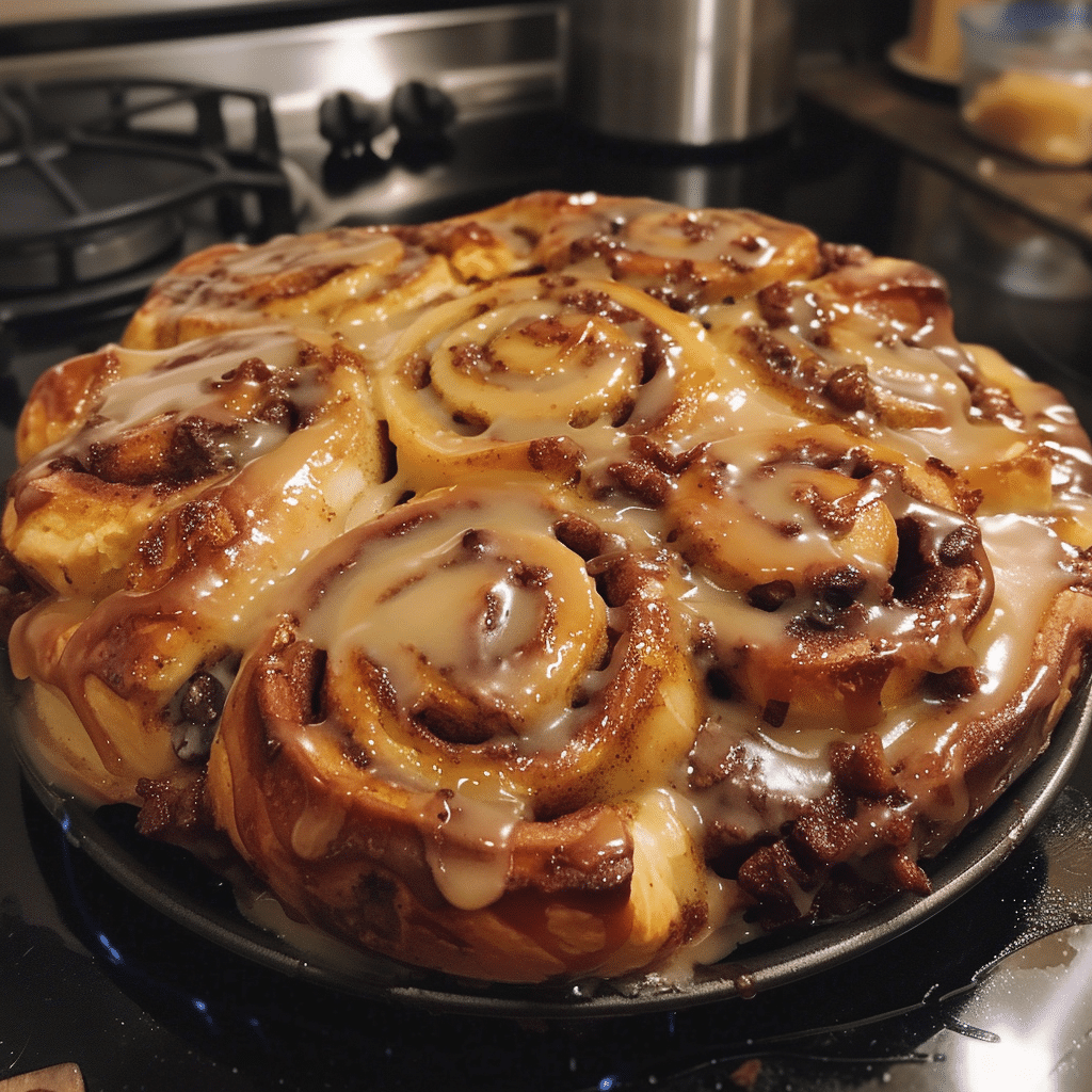 Preheat your oven to 350°F. Bake the giant cinnamon roll for 25–35 minutes, or until golden and baked through at the centre. Meanwhile, prepare the frosting by beating cream cheese, powdered sugar, vanilla, and a bit of milk until smooth. Spread frosting generously over the warm roll so it melts into the crevices. Let the roll cool slightly before serving to allow the layers to settle and become extra gooey.