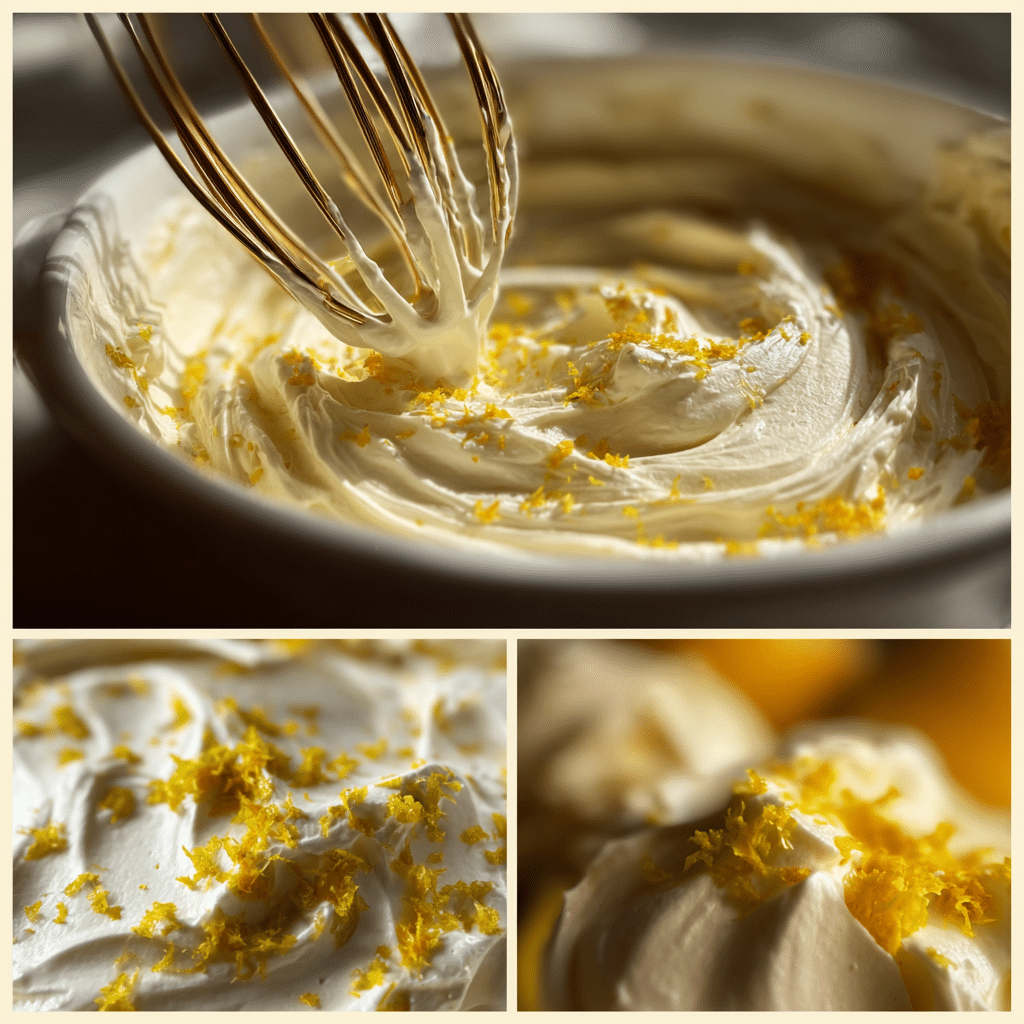 In a large mixing bowl, beat the mascarpone until smooth. In a separate bowl, whip the heavy cream with sugar and vanilla until soft peaks form. Gently fold the whipped cream into the mascarpone, followed by lemon zest, mixing just until smooth and airy.