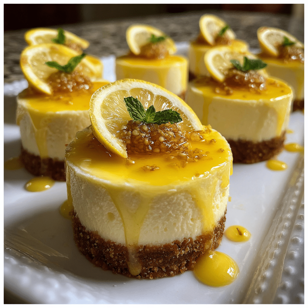 These mini lemon cheesecakes feature a buttery graham cracker crust, creamy lemon-infused cheesecake filling, and a refreshing tangy finish — perfect for parties or a light dessert.