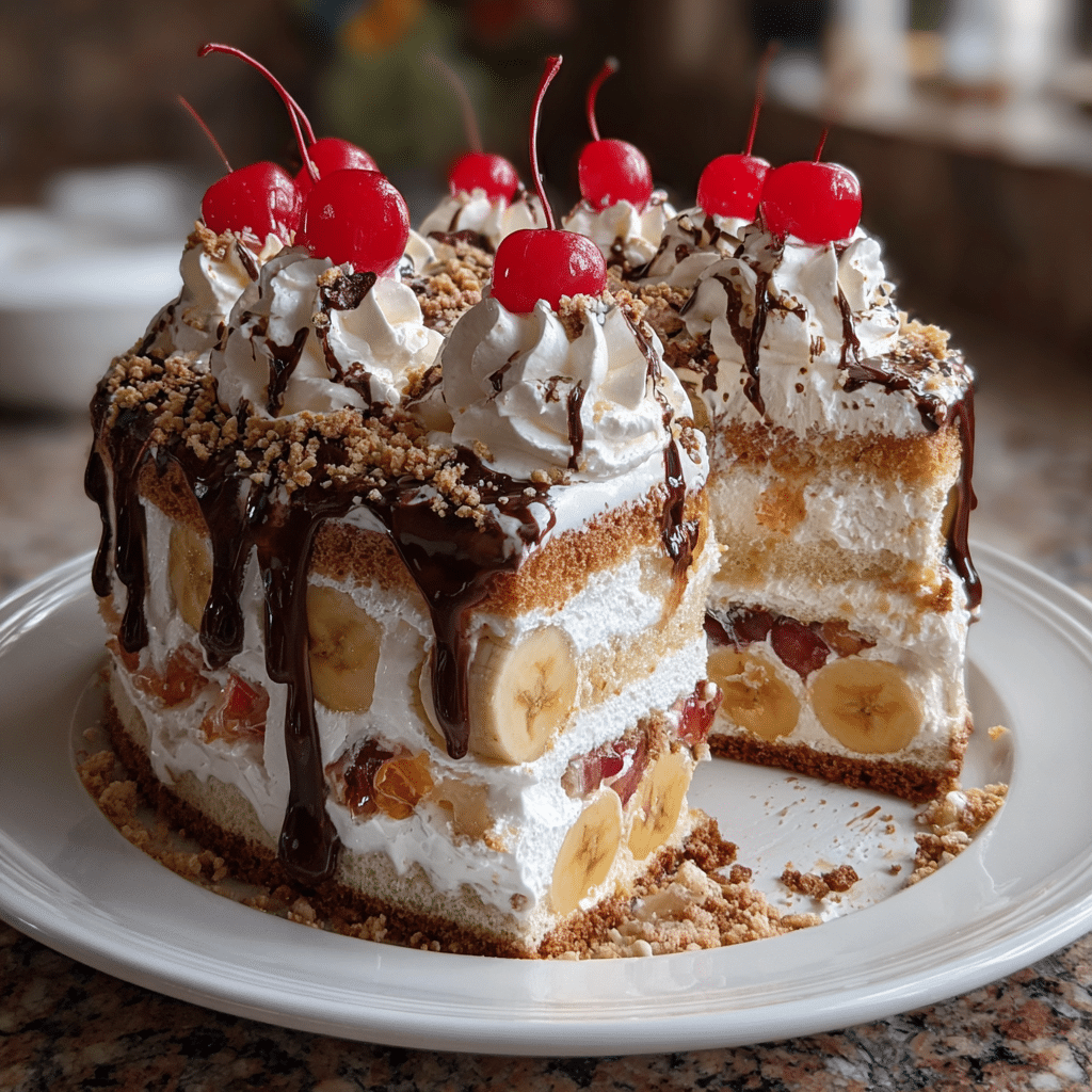 A classic no-bake dessert inspired by the flavors of a banana split, featuring a graham cracker crust, creamy filling, fresh fruit, and chocolate topping.