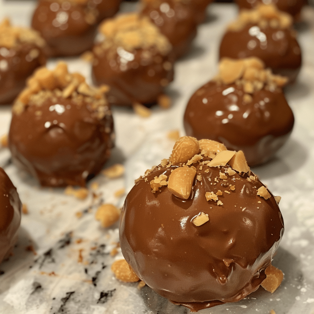 Classic no-bake peanut butter balls made with creamy peanut butter and coated in chocolate—an easy, bite-sized treat perfect for holidays or snacking.