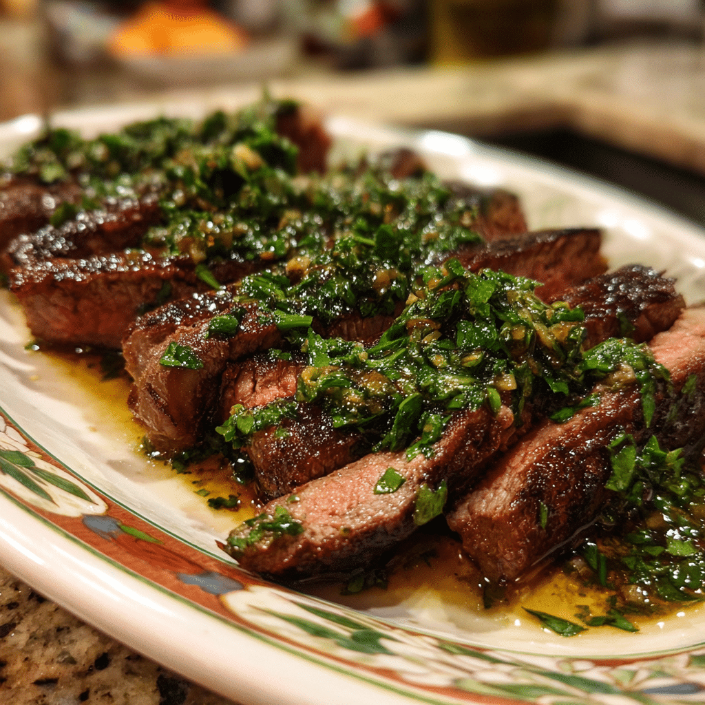 Leftover steak can be stored in an airtight container in the refrigerator for up to 3 days. To reheat, warm slices gently in a skillet or oven to avoid overcooking. Chimichurri sauce should be stored in a jar or container in the fridge for up to 1 week. Always bring it back to room temperature before serving, as the olive oil may solidify when chilled.