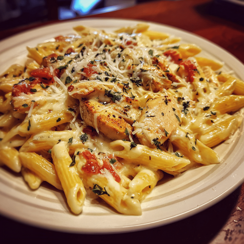 A rich and creamy cheesy chicken pasta made with tender chicken, perfectly cooked pasta, and a luscious blend of melted cheeses for the ultimate comfort meal.